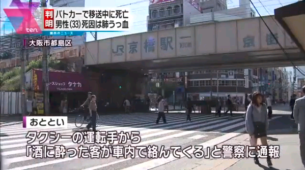 10月20日夜10時35分頃、タクシー運転手から「客が絡んでくる」と通報を受け、都島警察署の署員が現場に急行。保護された豊中市内在住の男性(33)が、署に連行される道中、パトカー内で急死したのだ。目撃者が証言する。